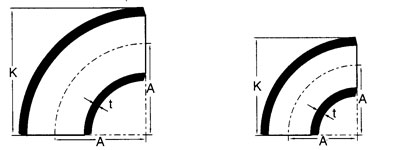 Łuki 90' wg ANSI B 16.9 (B 16.28) - zestawienie wielkości przekroju